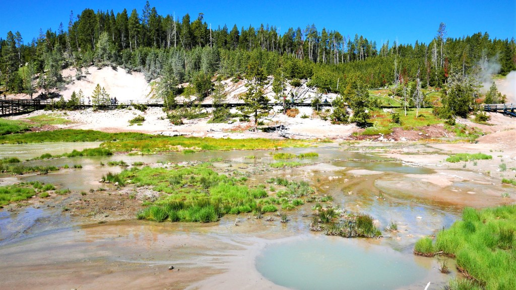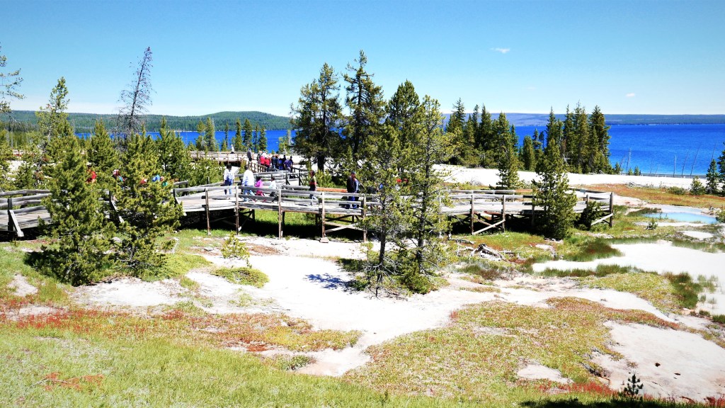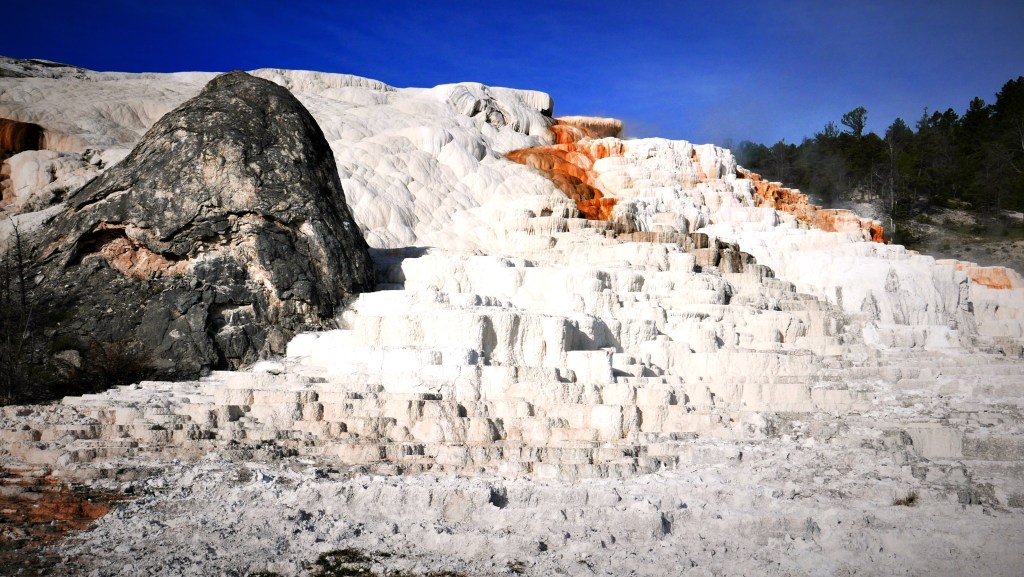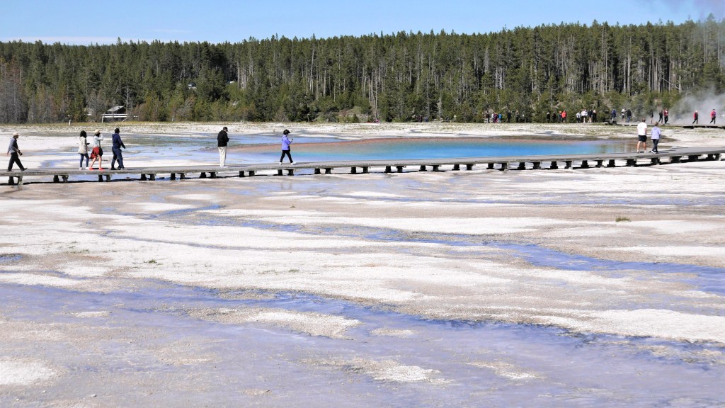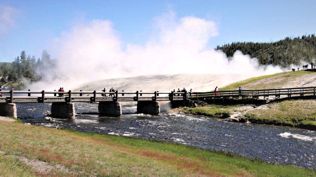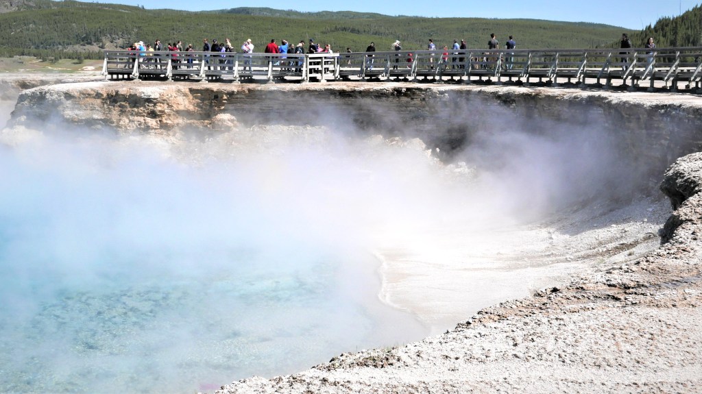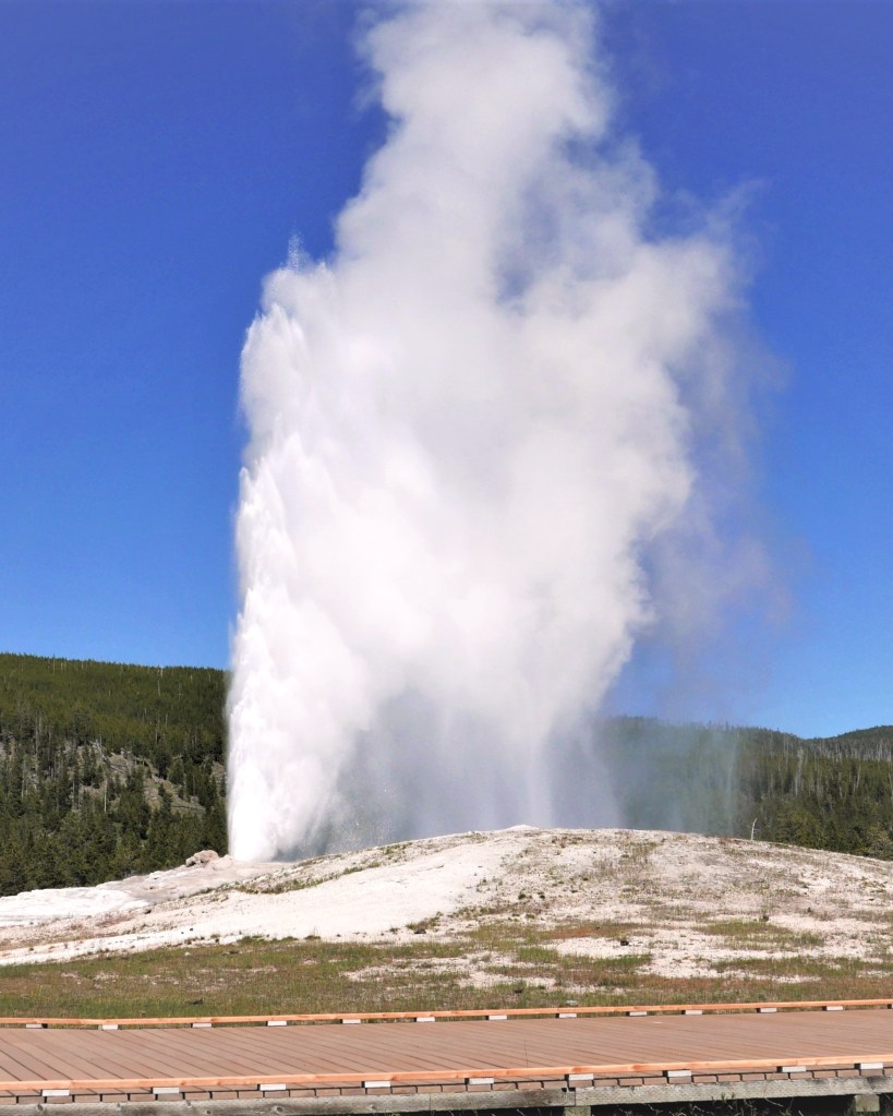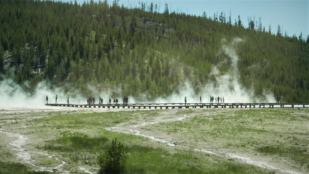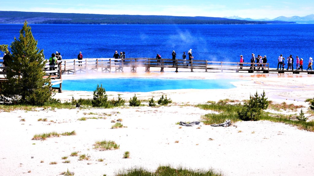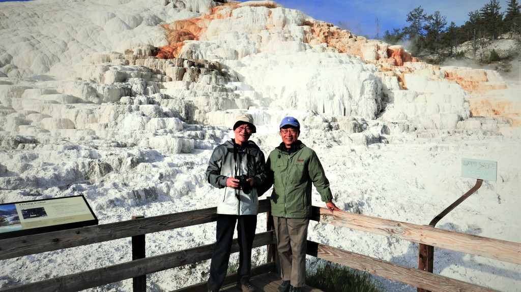 여기서 부터 ‘Yellowstone National Park,’ Wyoming 이다. 미국 최초의 국립공원 ‘Yellowstone National Park’는 Wyoming 주 맨 서북부 모퉁이에 방대한 부지를 차지하며 자리잡고 있고, 거대한 초원을 서식지로 Buffalo, Moose, Bear 등 큰 동물이 거닐고, 유황 간헐천이 (Geyser) 뿜어나와 하늘로 치솟고, Hot springs가 여기저기 흩어져 있는 자연의 신비와 아름다움을 지닌 대 국립공원 이다. Folk song, “Oh, give me a home where the buffalo roam, where the deer and antelope play …” ‘Home on the range’를 연상케하는 ‘Yellowstone National Park’ 주위의 풍물들 … 유황 Hot springs … ‘The Old Faithful’ geyser가 뿜어 나오는 시간에 맞추어 모여든 관광객들 …‘Old Faithful Geyser’는 약 90분에 한번 eruption이 일어나고, 길면 약 5분간 치솟는 높이가 130 feet 정도라고 한다. 정말 ‘Nature’s Wonder’ 가운데 하나인 것 같다.산에서 내리는 눈/빗물과 유황물이 강으로 흘러나와 큰 바다물과 합치게 되어있다.At ‘Mammoth Hot Springs,’ Wyoming … ‘Yellowstone National Park’의 North entrance로 들어오면 ‘Mammoth Hot Springs’가 있다. Limestone이 비, 바람, 온도에 부식되어 이루어진 회귀한 모습의 바위돌 들이다. 보통의 경우는 이런 현상은 동굴 (Cave) 안에서 이루어 지는데, 여기는 마치 동굴 안이 확 뒤집혀 밖으로 나온 현상이라고도 형성된 과정 표현을 쓰기도 한다. 많은 관광객의 기념사진 배경으로 각광 받는 ‘Liberty Cap’ 바위가 아래에 보인다.▼녹아 내린 Limestone이 Terrace를 이룬 것이 사진 오른쪽에 ‘Palette Spring Terraces’ 이고, 사진 왼쪽에 시커먼 것이 ‘Devil’s Thumb’ 이다.‘Mammoth Hot Springs’ 입구 부터 시작하는 우리가 선 이 Boardwalk는 1.75 miles의 길이로, 이곳 Upper and Lower Terraces에 이어져 있어 안전하고 편안하게 걸어 다니며 주위 경관을 볼 수 있다.‘Orange Spring Mound’가 옆에 눈 같이 하얀 Terrace의 색상과 대조를 이루며 보이고 있다.다음 관광지는 ‘Grand Canyon of Yellowstone’ 이다. 큰 폭포가 흘러 내리는 협곡이 장엄하고 아름답다. 폭포의 높이가 308 feet가 되는 ‘Lower Falls of the Yellowstone River’의 웅장한 모습 …At the beautiful ‘West Thumb Geyser Basin’ …넓고 아름다운 ‘Yellowstone Lake’를 뒤로 배경으로 하고 앞에 보이는 ‘West Thumb Geyser Basin’ 에는 조그만 Geyser 들이 여기저기 제각기 다른 모양과 색상을 띄우며 뽑내듯 흩어져 있다. At ‘West Thumb Geyser Basin’ … ‘Yellowstone Lake’ 앞에 펼쳐진 형형색색의 Geyser들 …넓고 넓은 ‘Yellowstone Lake’ 에서 Kayak 뱃놀이는 참 멋진 것 같다.‘Yellowstone Lake’를 배경으로 기념사진 한 Cut …우리의 마지막 관광 행선지는 ‘Grand Teton National Park,’ Wyoming 이다. 하늘을 찌르듯 눈 덮힌 높은 산의 위용이 아주 장관이다.미 전국에서 Ski Resort로 이름 있는 ‘Jackson Hole,’ Wyoming 에서 Tram cable car를 타고 10,000 feet가 넘는 산 정상에 올라 주위 Teton Mountain range를 관망하는 여정이다.산뜻하게 아름다운 Ski 관광 도시 Jackson, Wyoming은 ‘Jackson Hole Valley’에 위치한 조그마한 도시로, 유명한 Ski Resort가 세개나 있고 비행장이 바로 가까이 있어 Skier 들이 자주 찾는 깨끗한 소 도시 이다.건물 뒤로 Ski slope 들이 여기 저기 보인다.Tram cable car를 타고 10,000 feet이 넘는 산 정상에 올라 가서 가까이 장엄한 Teton mountains를 관망하는 것이 참으로 멋지다.Cable car가 향하여 가는 10,000 ft 이 넘는 (‘백두산’ 보다 더 높음) 산 정상이 사진 가운데 위쪽에 보인다.15분이 채 않되는 Tram ride 중에 아래로 내려다 보는 경치가 또한 너무 아름답다.이제 산 꼭대기에 다 올라 와서 주위에 펼처진 눈 덮인 Teton Mountains 설경이 괭장하다. 눈덮인 산 꼭대기에는 부는 바람은 이만저만이 아니게 강하다. 산 정상에 상당히 큰 Cafe가 있어 Coffee/tea, Waffle, Chocolate 등으로 친구들과 Break을 갖는 시간이 즐거웠다. ‘Grand Teton National Park’ 관광은 미 National Park로 가장 역사가 깊은 ‘Yellowstone National Park’를 보러 오는 관광객들에겐 꼭 같이 보아야 할 명소인 것 같다. ‘백두산’ 보다 한배 반쯤 더 높은 이 산 꼭대기에서 주위 파란 하늘과 산과 들을 배경으로 찍은 사진에 ‘Grand Teton Mountain Range’의 위용이 너무나 장엄하고 아름답다.